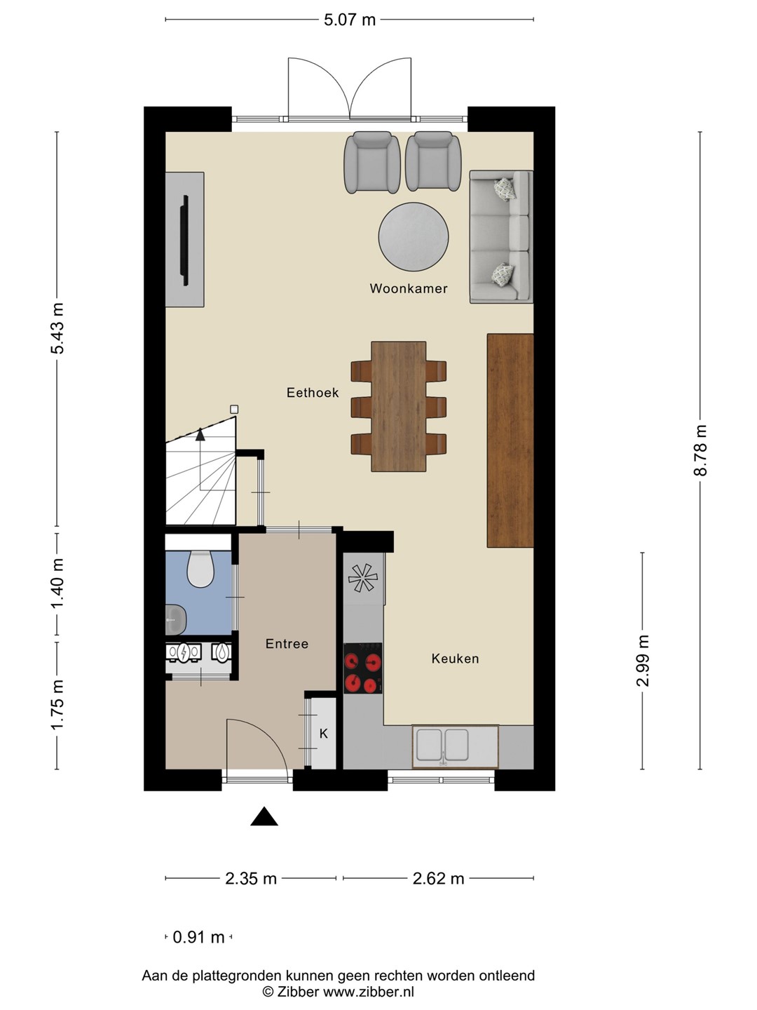 Entree. hal, toilet, meterkast, woonkamer, keuken, tuin met berging