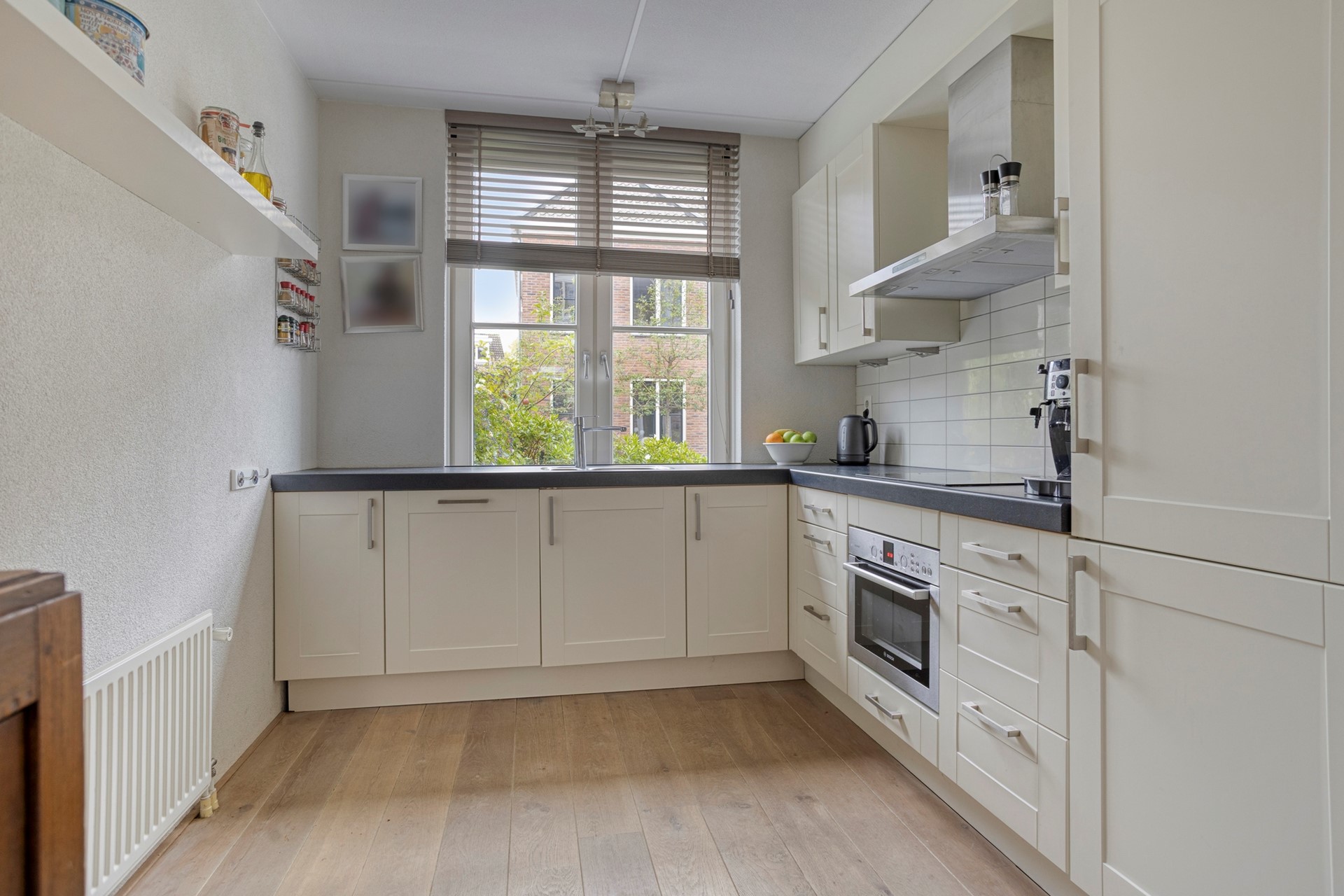 De keuken bevindt zich aan de voorzijde van de woning, met een prettig uitzicht op de straat. De keuken is uitgevoerd in een lichte kleurstelling en uitgerust met een vaatwasser, inductiekookplaat, afzuigschouw, combimagnetron, koelkast en vriezer.