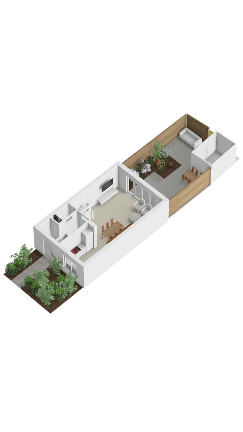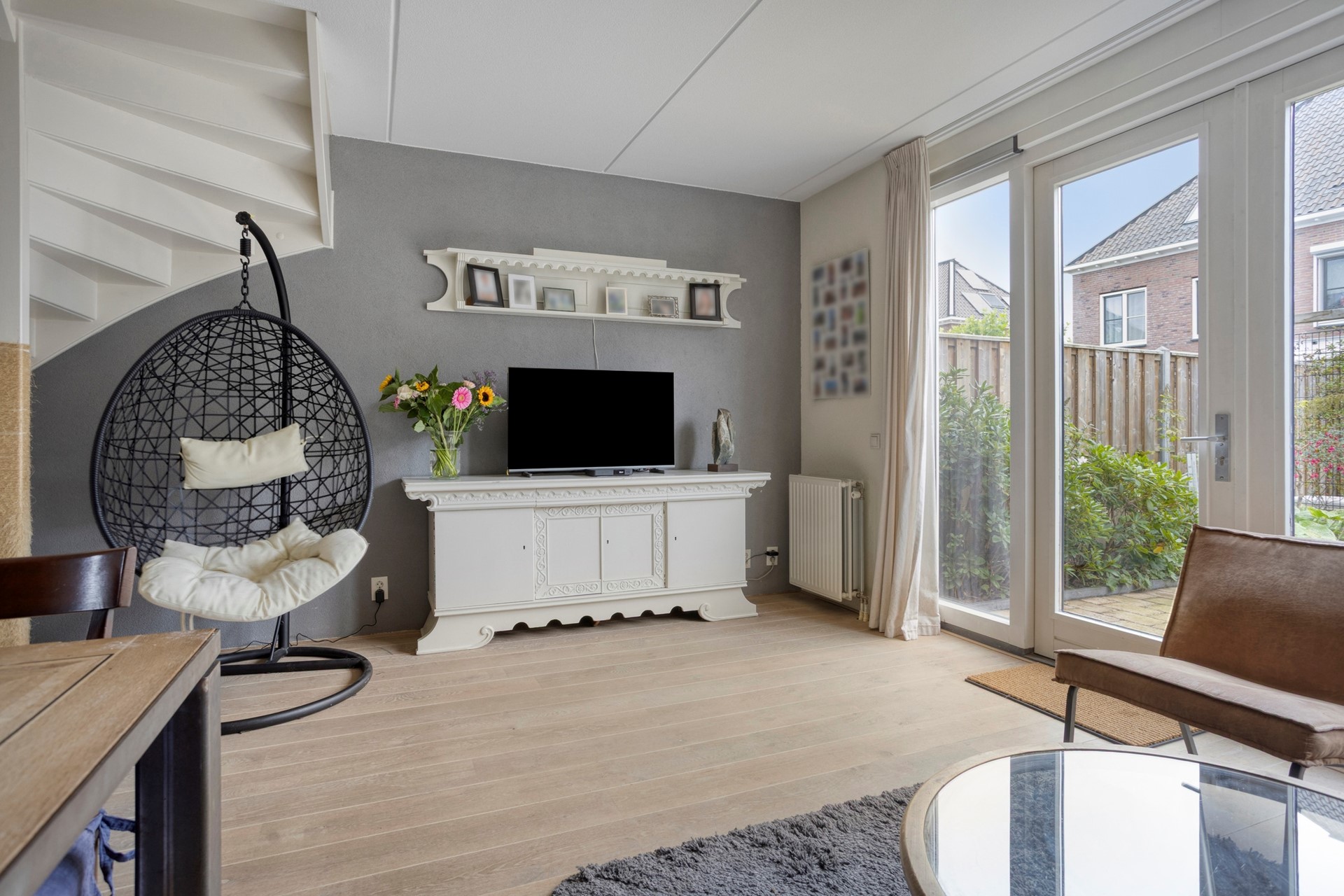 De tuingerichte woonkamer biedt dankzij de grote raampartijen veel lichtinval en een directe verbinding met de tuin. Via de openslaande deuren of achterom is de onderhoudsvriendelijke tuin te bereiken, waar tevens een berging aanwezig is.