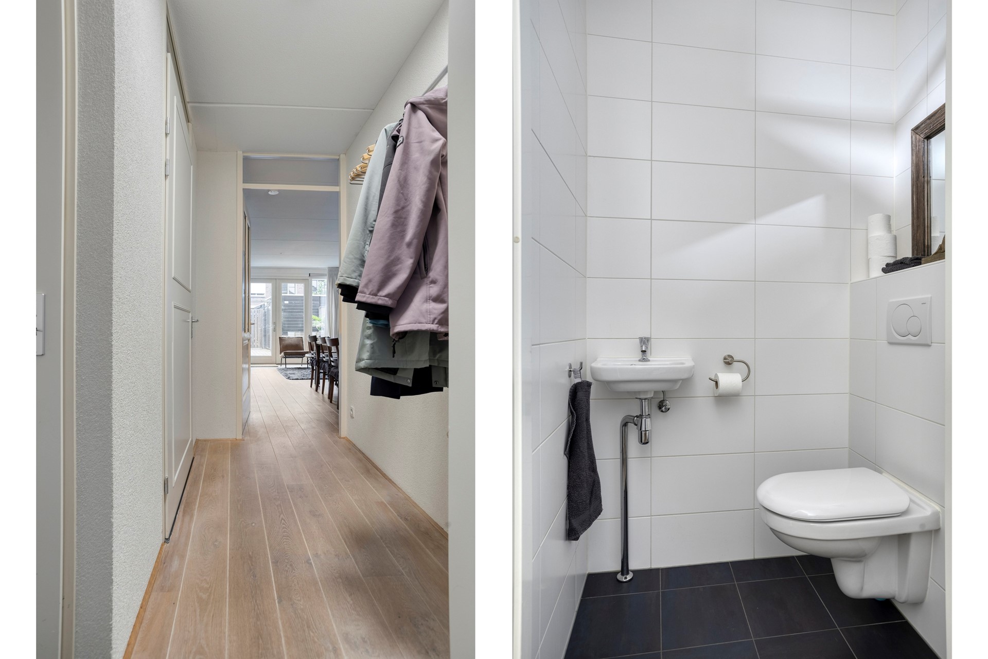 Wij nemen je graag mee door de woning: via de entree kom je in een ruime hal met een garderobenis, ideaal voor het stallen van een kinderwagen en het opbergen van de jassen. Verder vind je hier de meterkast, het toilet en de toegang tot de woonkamer. Bij de open trap is een kozijn met deur geplaatst waardoor de warmte op de begane grond goed behouden blijft. De woning is voorzien van een moderne wandafwerking en een fraaie eikenhouten vloer.