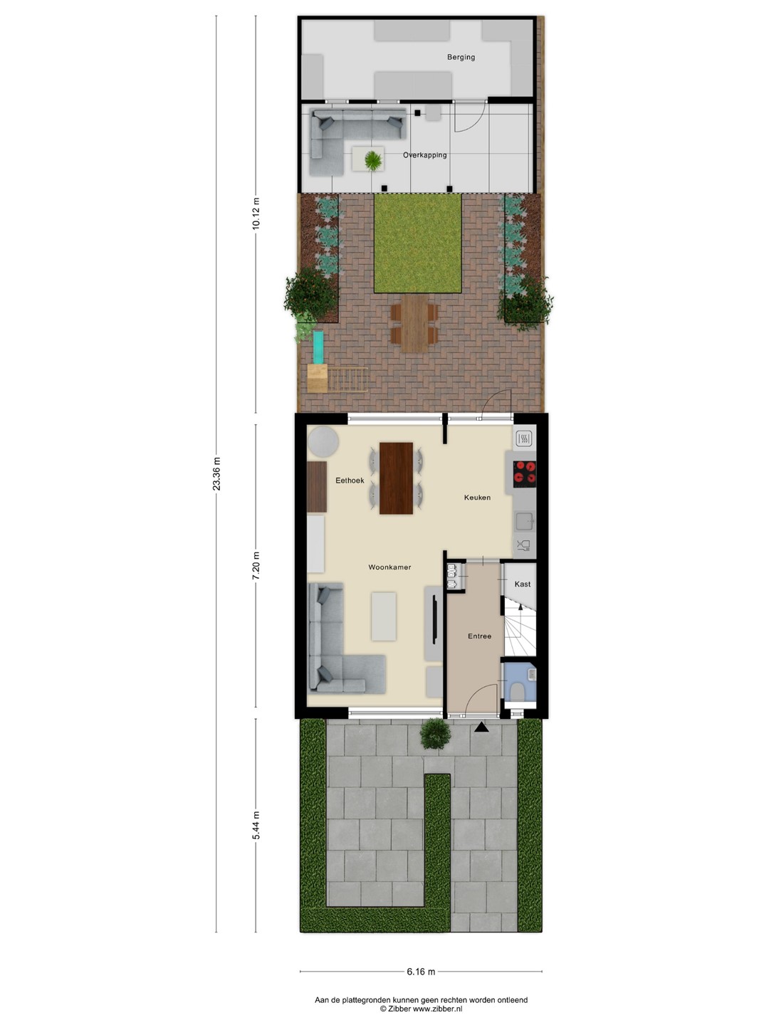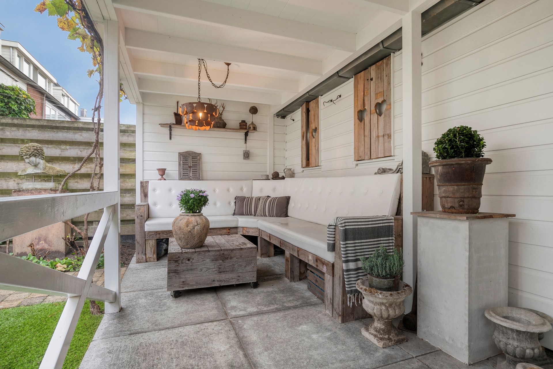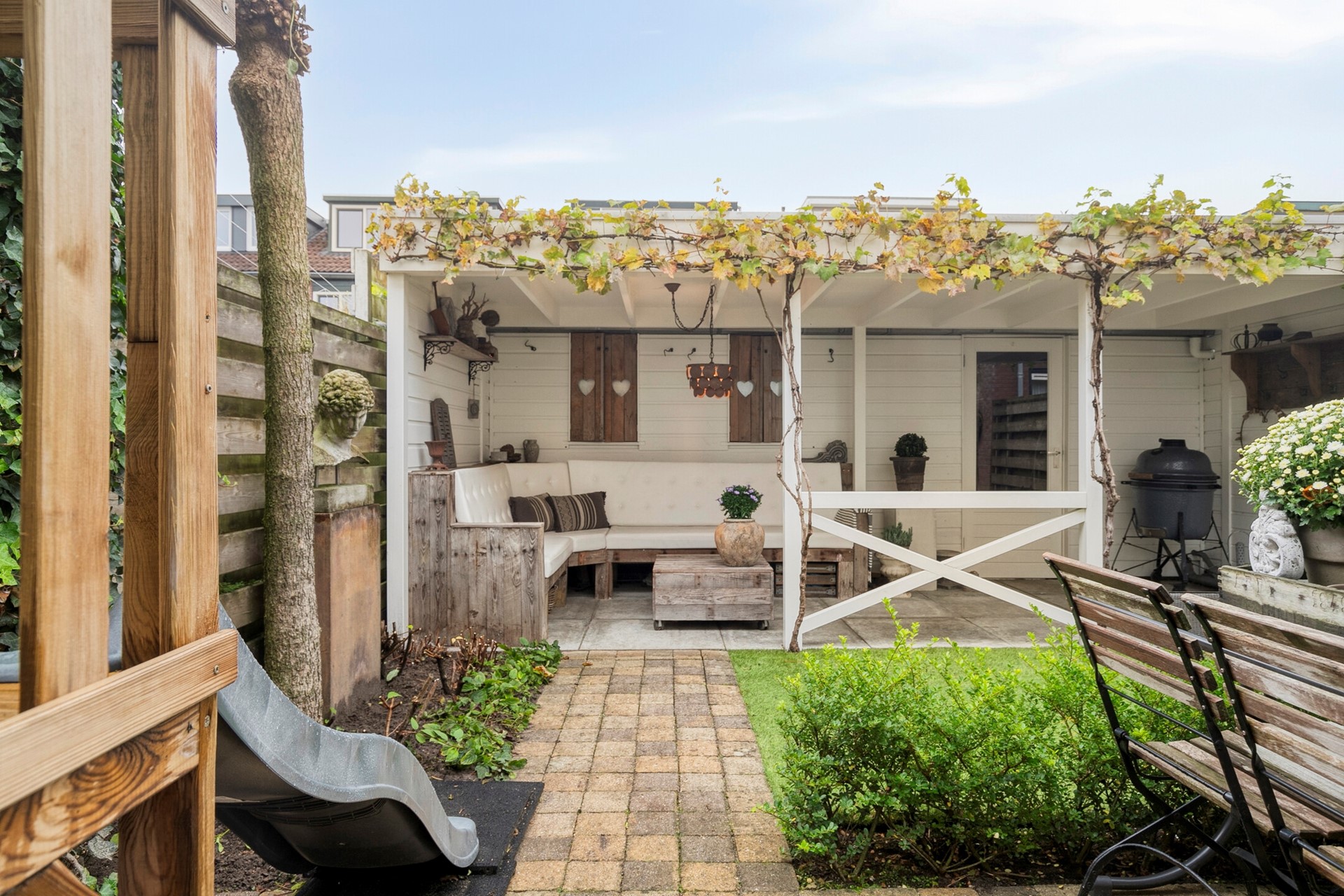 De tuin is fraai aangelegd en er is sprake van een heerlijke overkapping aan de berging. De berging is geïsoleerd, heeft een warmwater voorziening en is ook vanuit een achterpad bereikbaar.