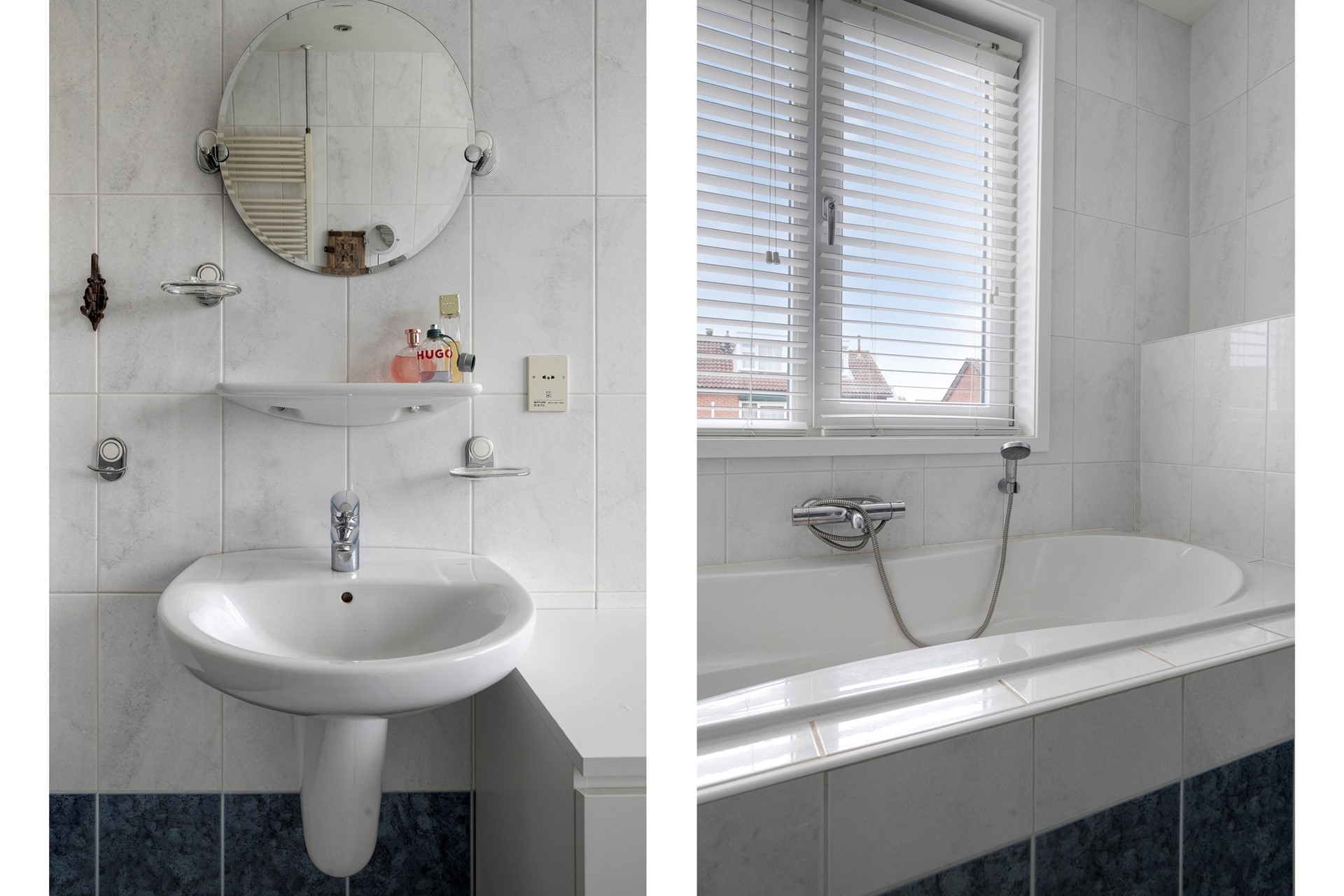 Op de verdieping is er een overloop met vaste kast, zijn er twee grote slaapkamers en is er badkamer met een ligbad, douche, toilet en wastafel. Daarnaast is er nog een aparte wasruimte.