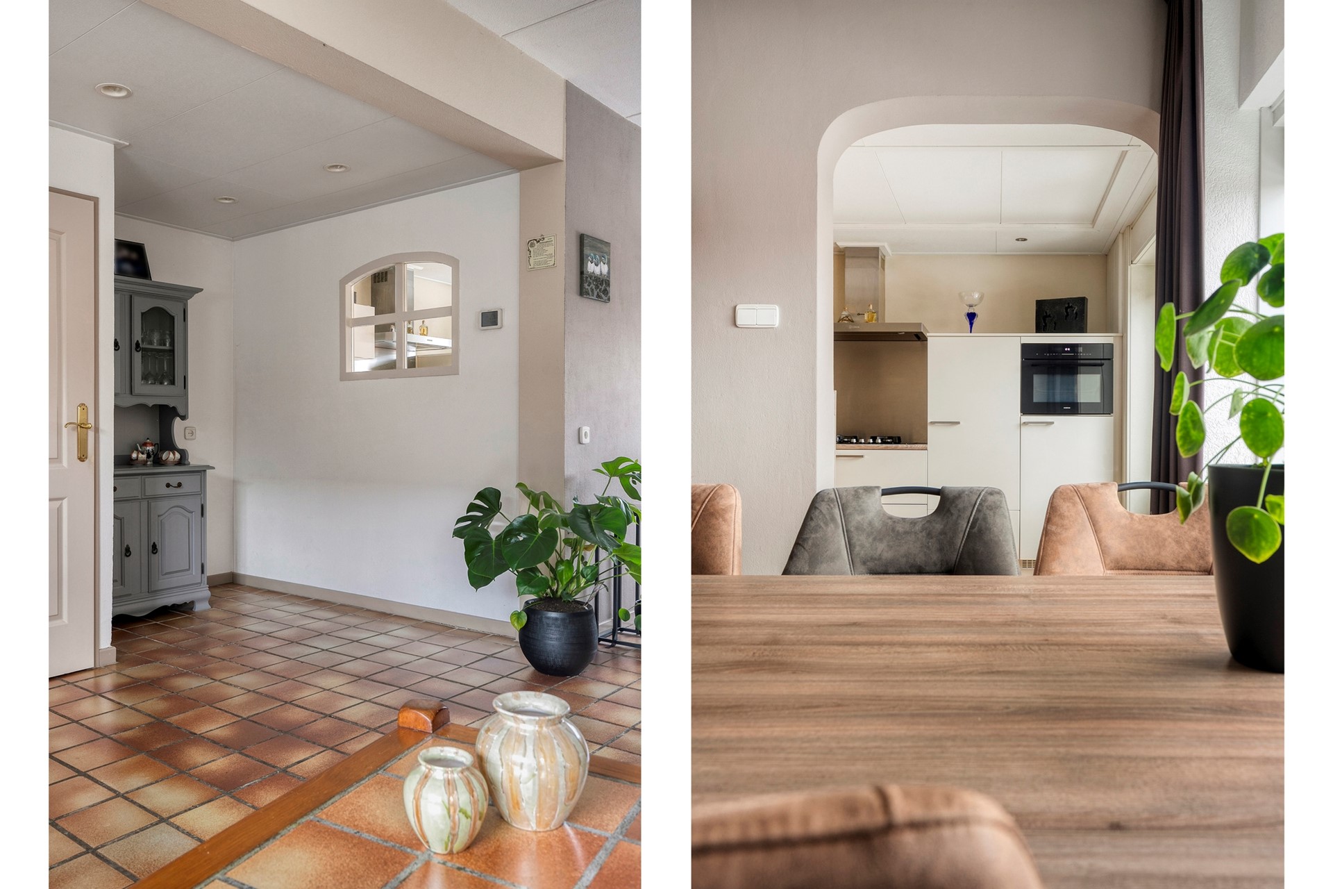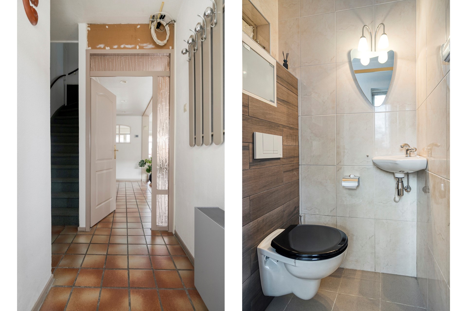 Hal, toilet, trapopgang, woonkamer en keuken.