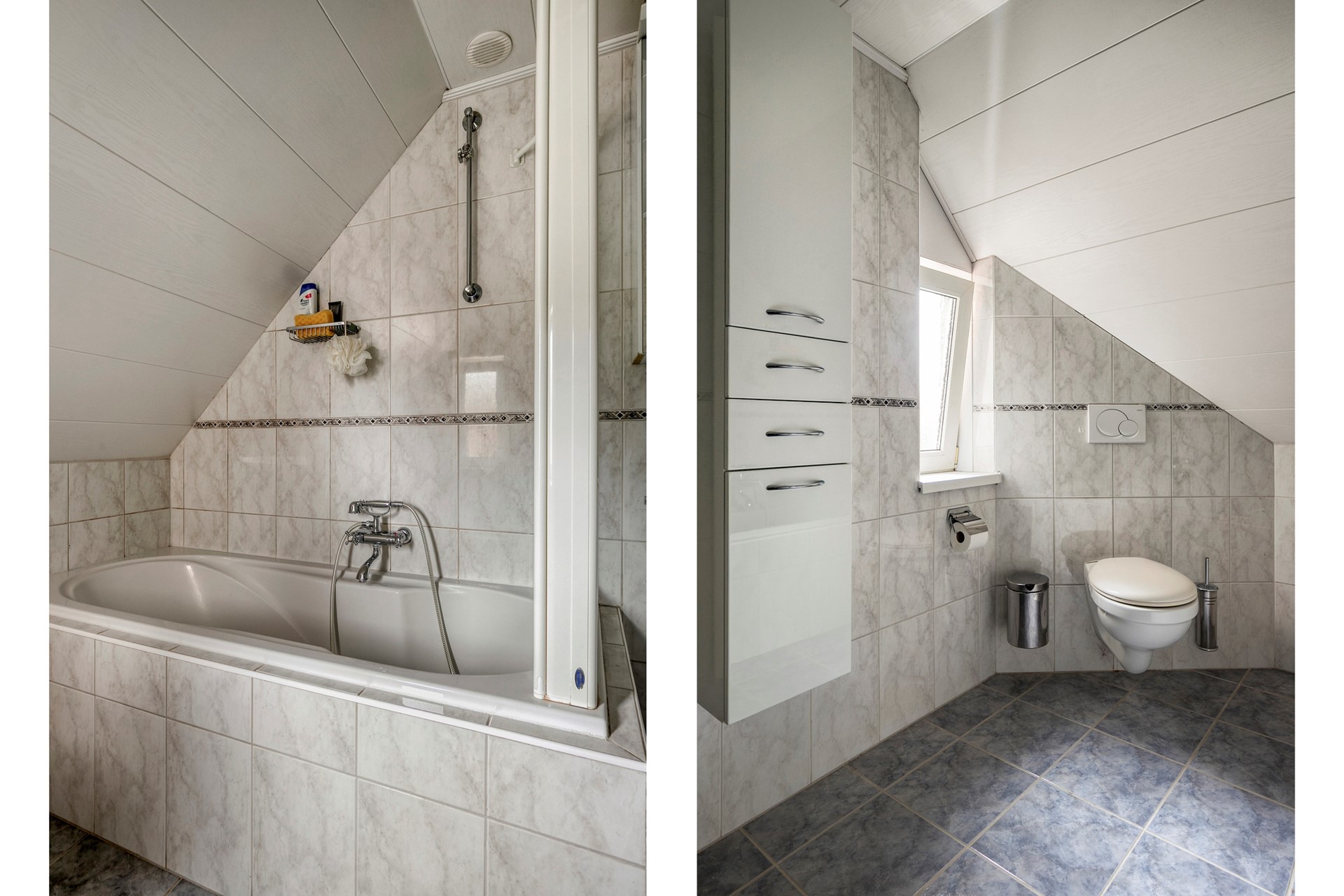Op de eerste verdieping is er een overloop met toegang tot de drie goede slaapkamers en badkamer met een ligbad (douche in bad), zwevend toilet en wastafel meubel. Via een vaste trap kom je de zolder met de voorzolder waar je de wasmachine en droger aansluiting vindt net als de cv ketel. Ook is op deze verdieping de vierde slaapkamer gerealiseerd.